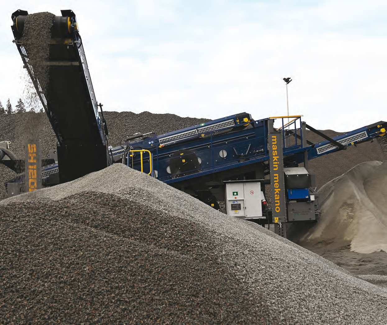 Crible final compact à double tamis de 1,4 × 4,8 m sur châssis VibroBlock. Prêt en 10 min avec trois bandes repliables, course de 12 mm à 800 tr/min et entraînement électrique silencieux.
